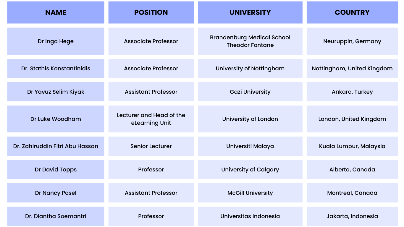 The project will be supported by an international advisory board consisting of a select group of experts in virtual patients, eLearning, and/or regional healthcare education. The advisory board will provide guidance and support to the project team, particularly when challenges arise or strategic decisions are needed.
